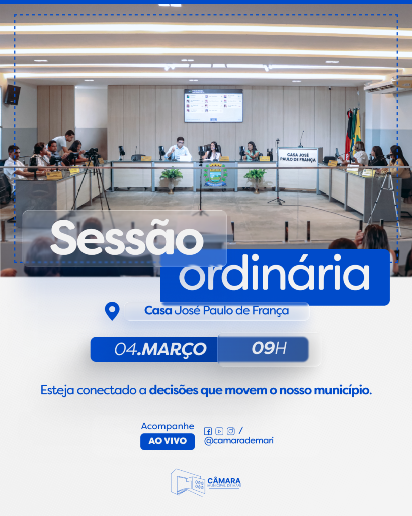 A Câmara Municipal de Marí realiza nesta quarta-feira, às 09h, mais uma sessão ordinária no plenário da Casa Legislativa. O encontro reunirá os vereadores para apreciação, discussão e votação de matérias de interesse da população mariense.